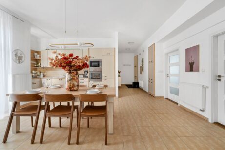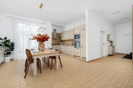 Dispozice nabízí čtyři samostatné pokoje – takže každý může mít svůj klid: dětské pokoje, pracovnu, hostinský pokoj nebo šatnu. K tomu samostatná kuchyně a praktické úložné prostory v podobě komory/spíže, které v městských bytech často chybí.