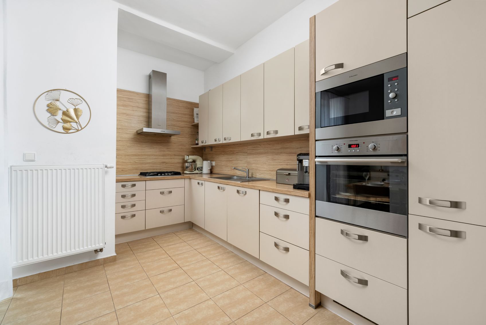 Součástí bytu je kuchyňská linka se zabudovanými spotřebiči: myčka, mikrovlnná trouba, trouba, varná deska i digestoř – takže můžete bydlet hned a postupně si byt doladit podle sebe.