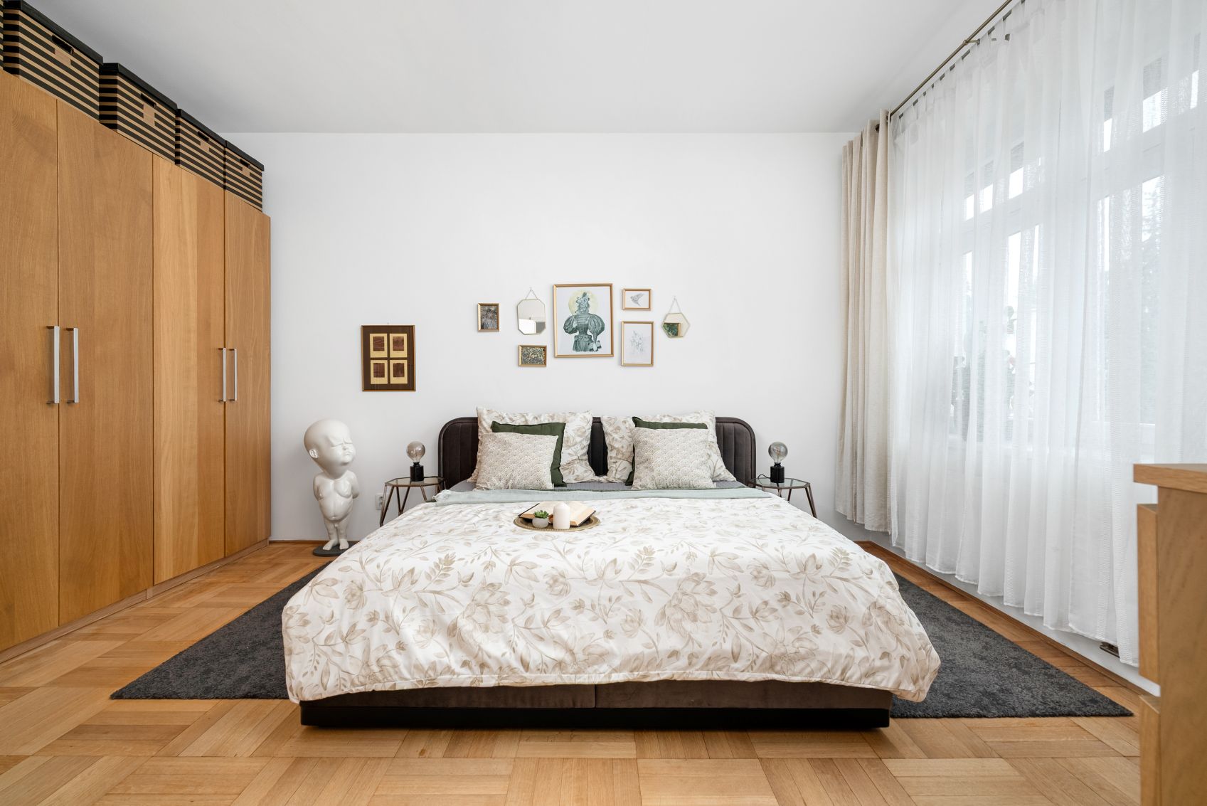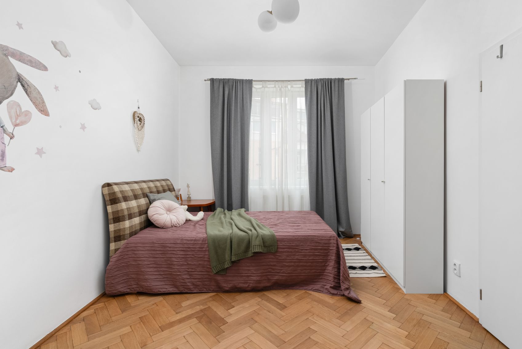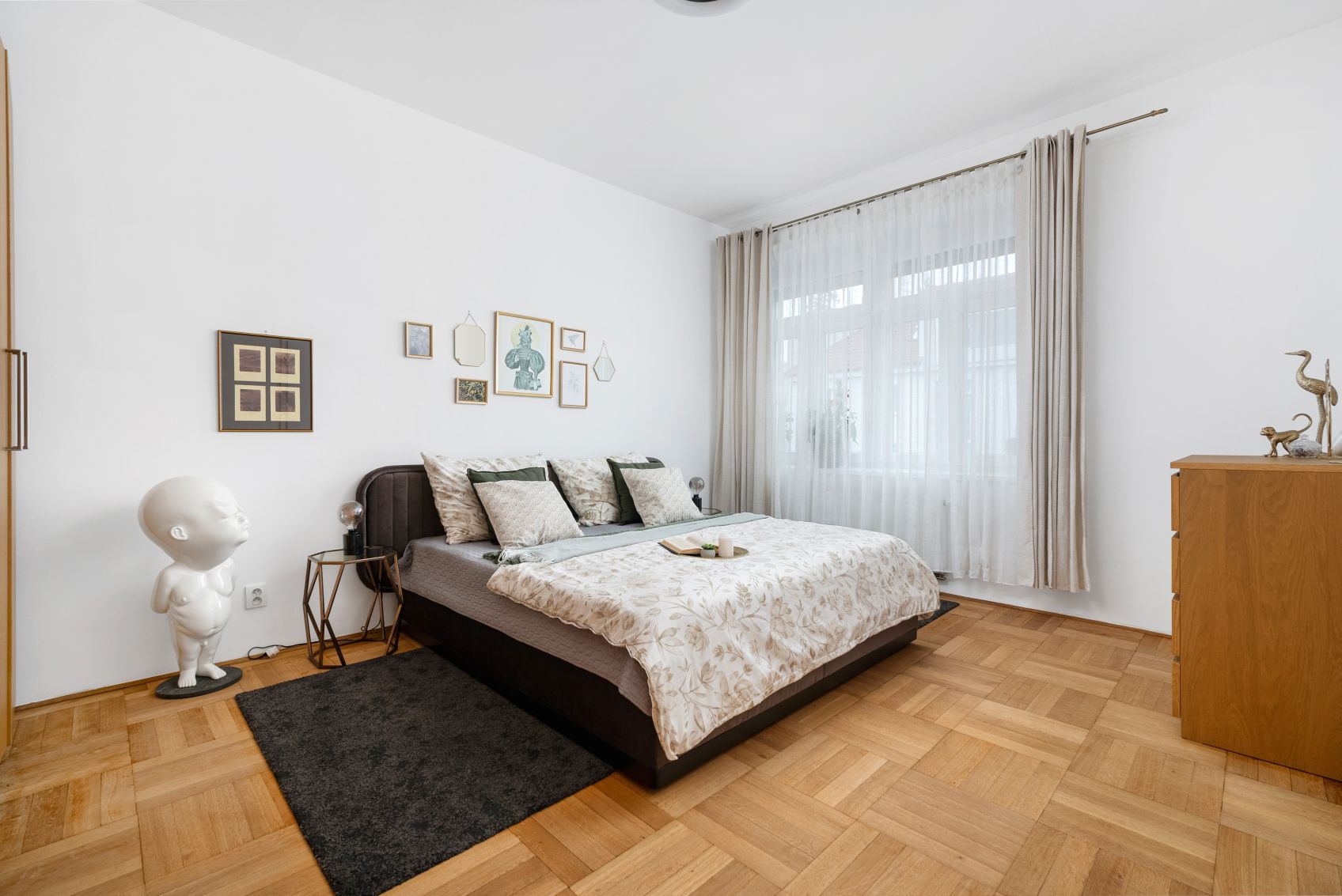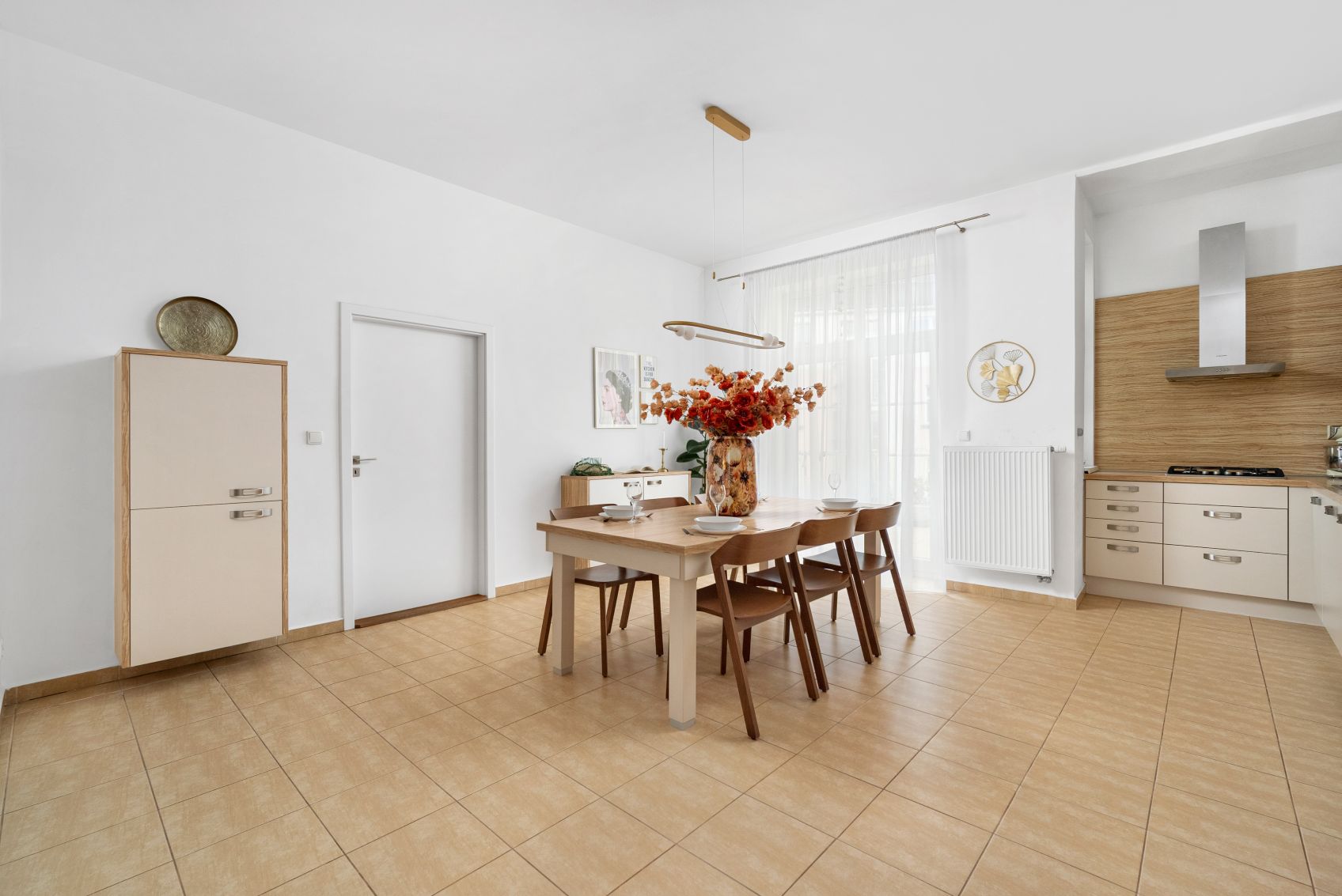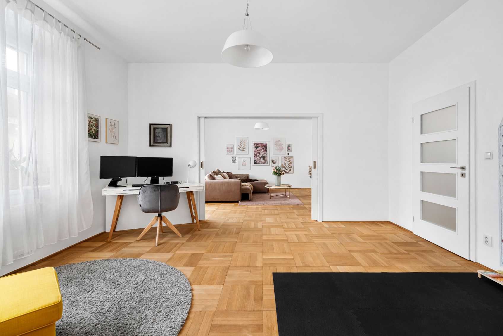 Dispozice nabízí čtyři samostatné pokoje – takže každý může mít svůj klid: dětské pokoje, pracovnu, hostinský pokoj nebo šatnu. K tomu samostatná kuchyně a praktické úložné prostory v podobě komory/spíže, které v městských bytech často chybí.